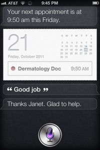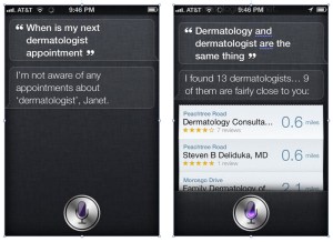 But it can also be annoyingly dense. For example it seems unaware that it is part of a particular phone and service network so it cannot answer questions like “How do I set up my voicemail?” except with a generic “voicemail” web search. And since it lives in the cloud, it is unable to set a local timer if it can’t connect to the network. Siri also lacks the kind of semantic context that makes variant utterances recognizable to human beings. It does not recognize “dermatologist appointment” can be on the calendar as “dermatology doc,” nor will it let me teach it that one is the same as the other.
